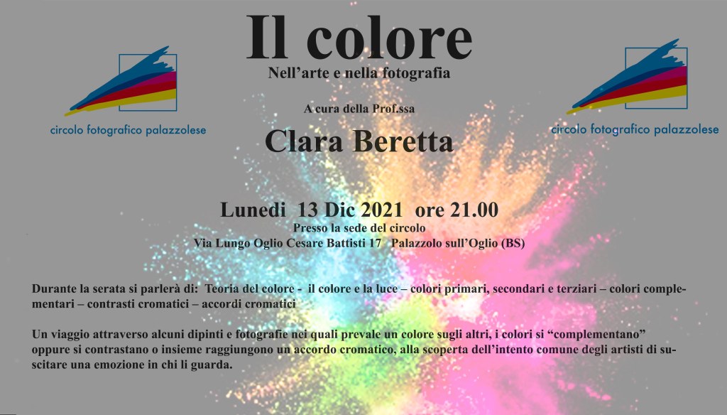Lunedì 13 Dicembre alle ore 21:00 presso la sede del circolo si terrà la lezione “Il colore nell’arte e nella fotografia” a cura della Prof.ssa Clara Beretta.