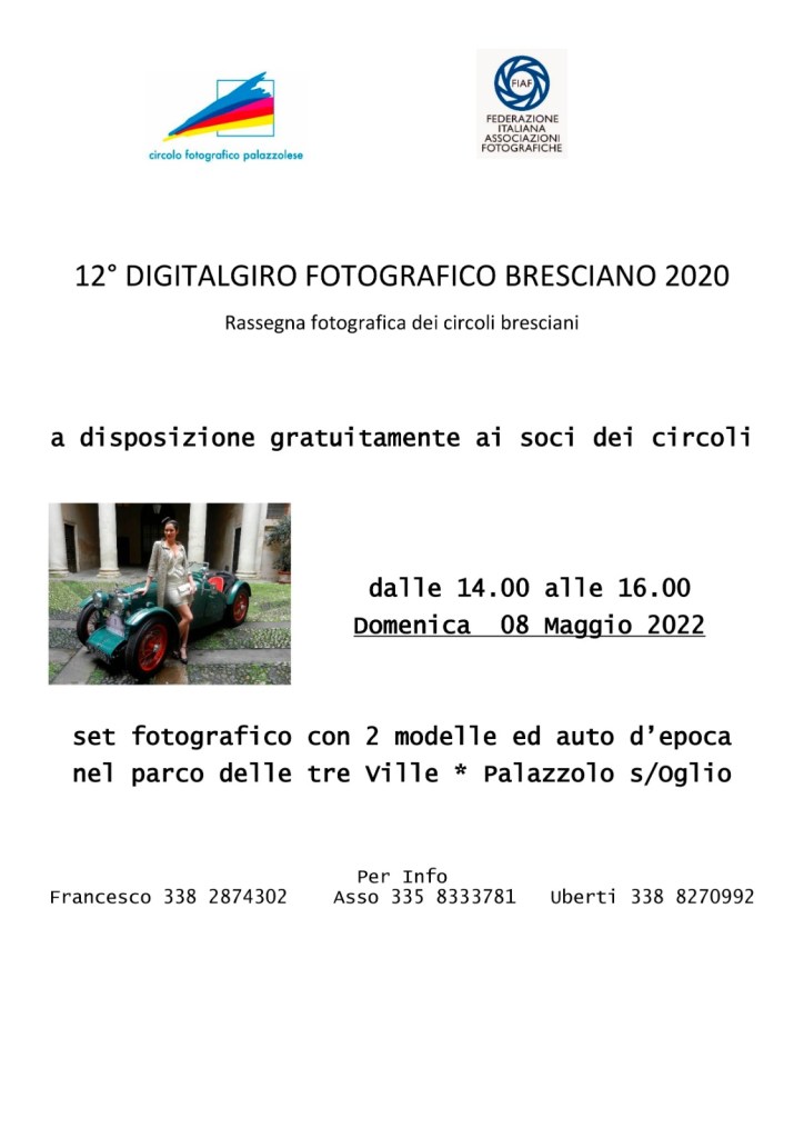 In occasione del 12° Digitalgiro Fotografico Bresciano 2020, per tutti i soci dei circoli partecipanti all’evento, è a disposizione gratuitamente un set fotografico con due modelle ed auto d’epoca presso il parco delle tre ville a Palazzolo s/O.