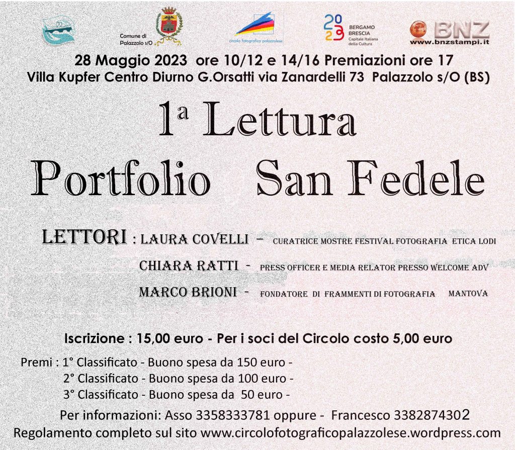 Il Circolo Fotografico Palazzolose è orgoglioso di organizzare per il giorno 28 Maggio 2023 dalle ore 10 alle ore 16 presso Villa Kupfer – Centro Diurno G. Orsatti a Palazzolo s/O la 1° Lettura Portfolio San Fedele intitolata al Santo Patrono del paese.