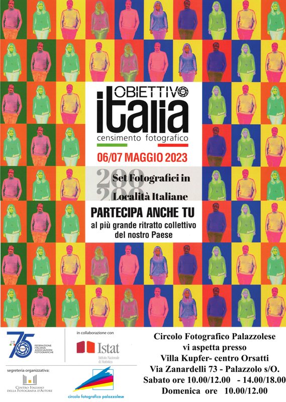 Il 6 e 7 maggio 2023 in contemporanea con gli oltre 550 Circoli Fotografici affiliati FIAF, allestiremo un set fotografico presso Villa Kupfer Centro Orsatti in Via Zanardelli a Palazzolo s/Oglio per raccogliere i ritratti degli Italiani e realizzare così il più ampio affresco corale della popolazione nazionale.