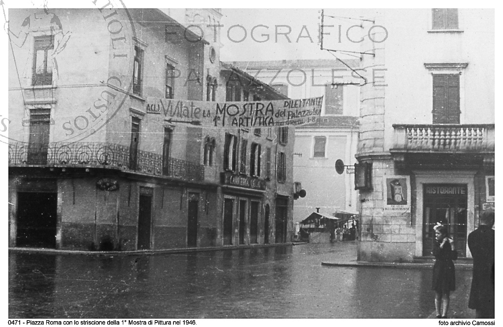 Piazza Roma con lo striscione della prima mostra di pittura